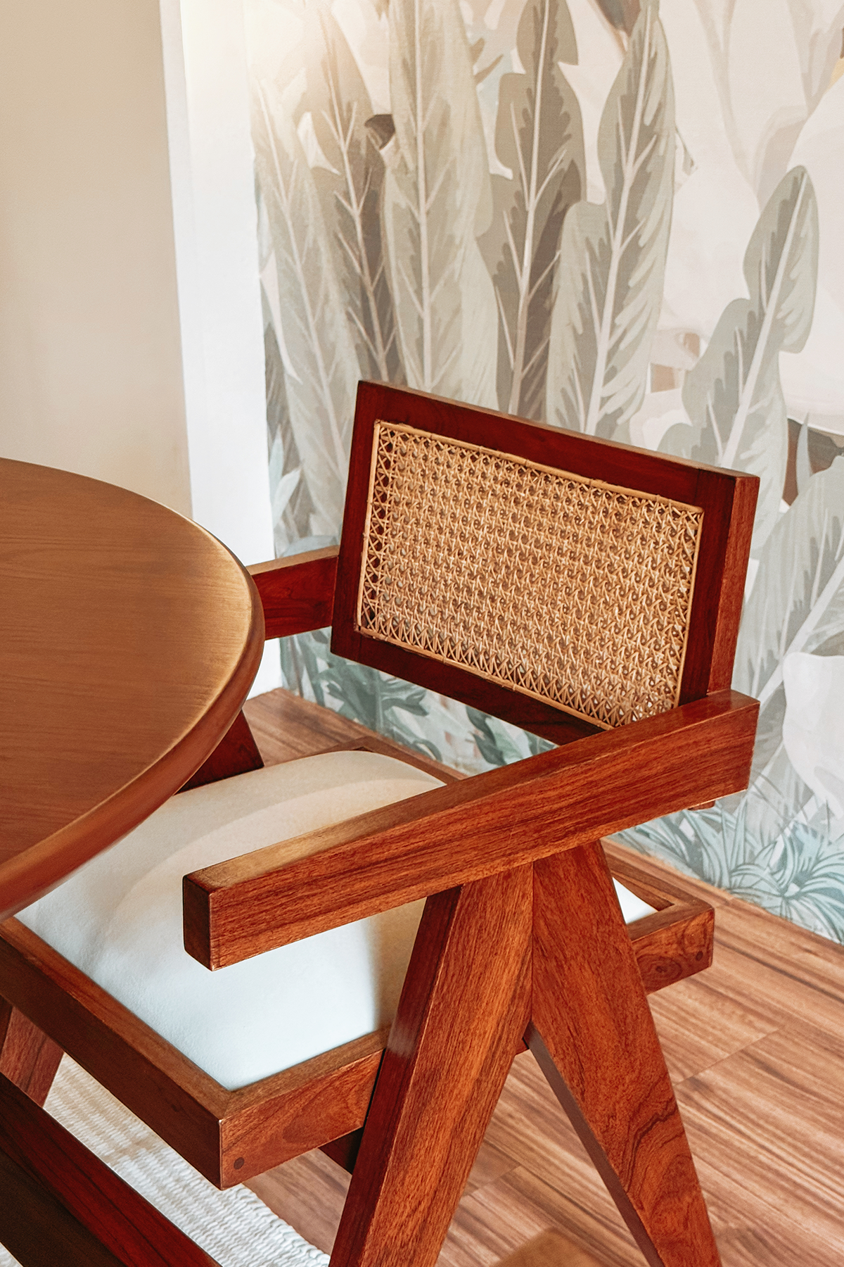 This beautifully curated dining collection features a round wooden table with a handwoven cane base, creating a warm interplay of texture and light. Paired with architectural V-shaped armchairs, the set blends organic materiality with contemporary form, making it a standout centerpiece for modern homes.