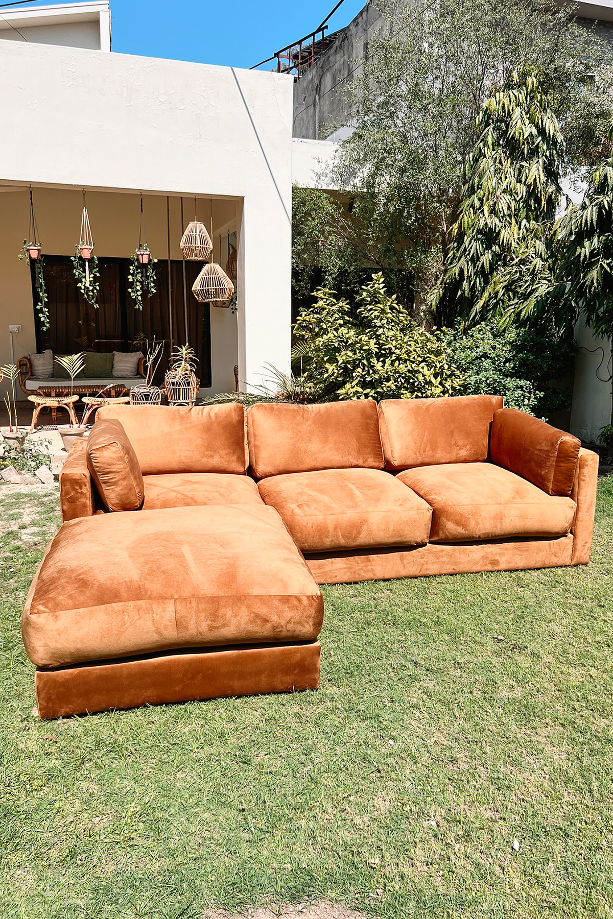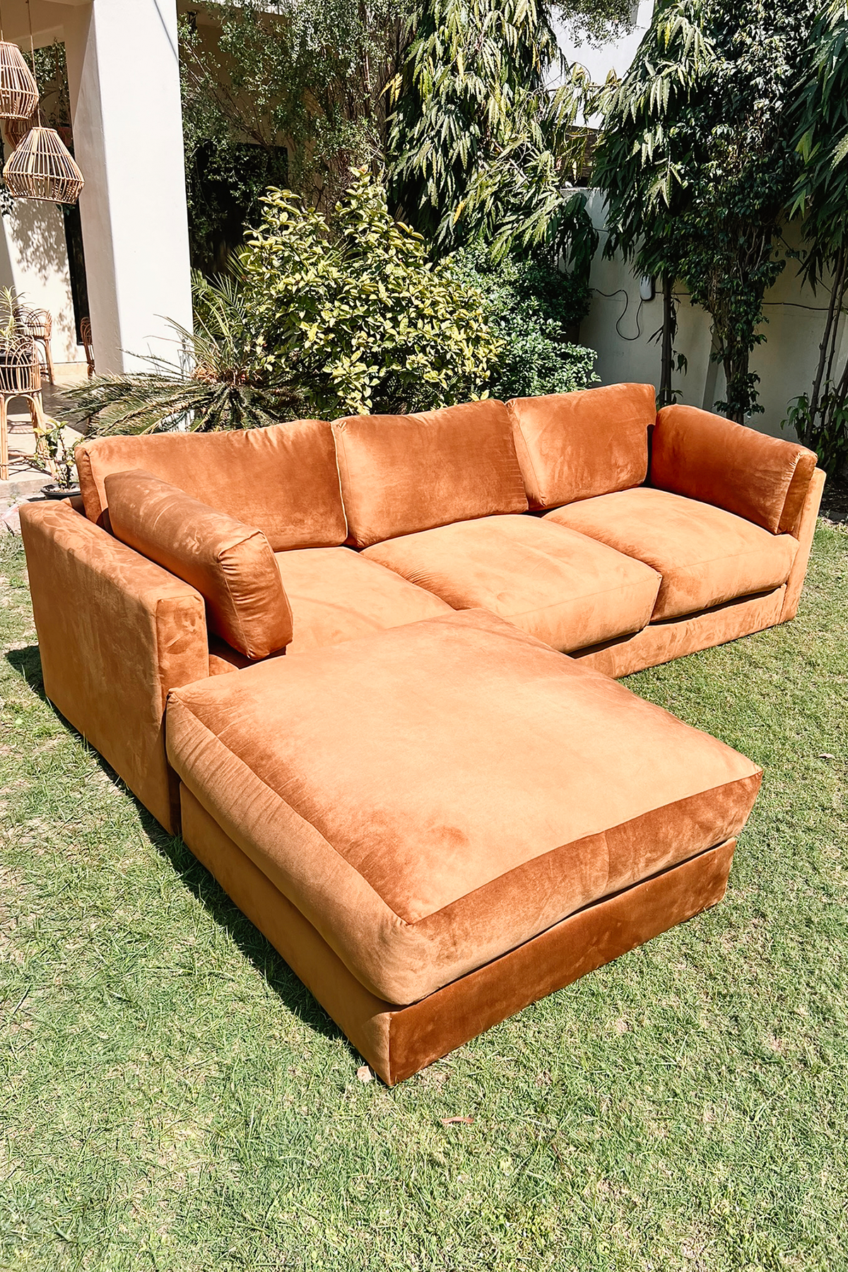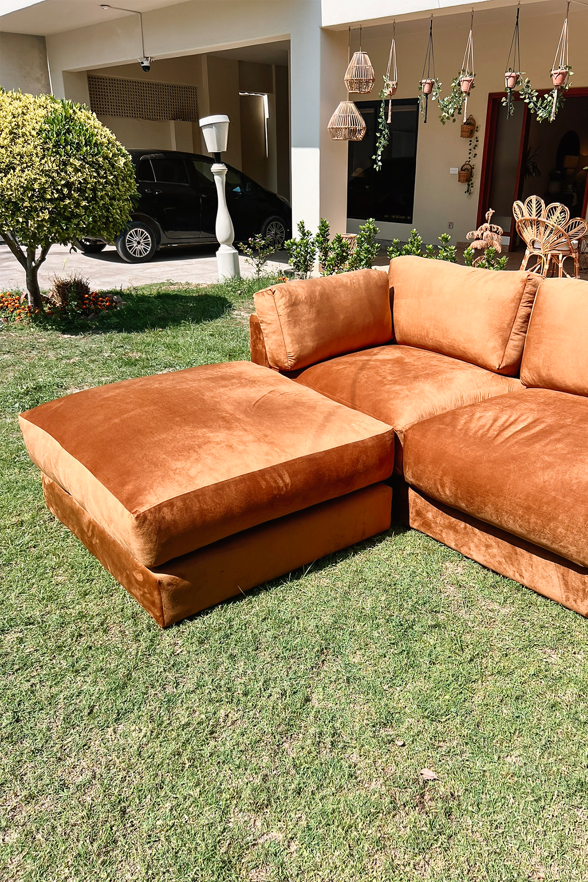 Sink into laid-back luxury with The Canyon Cloud Sectional — a plush, oversized lounge that brings comfort and style together effortlessly. Upholstered in a rich golden-brown velvet reminiscent of sunlit canyons, this statement piece is designed for sprawling, napping, gathering, and everything in between.