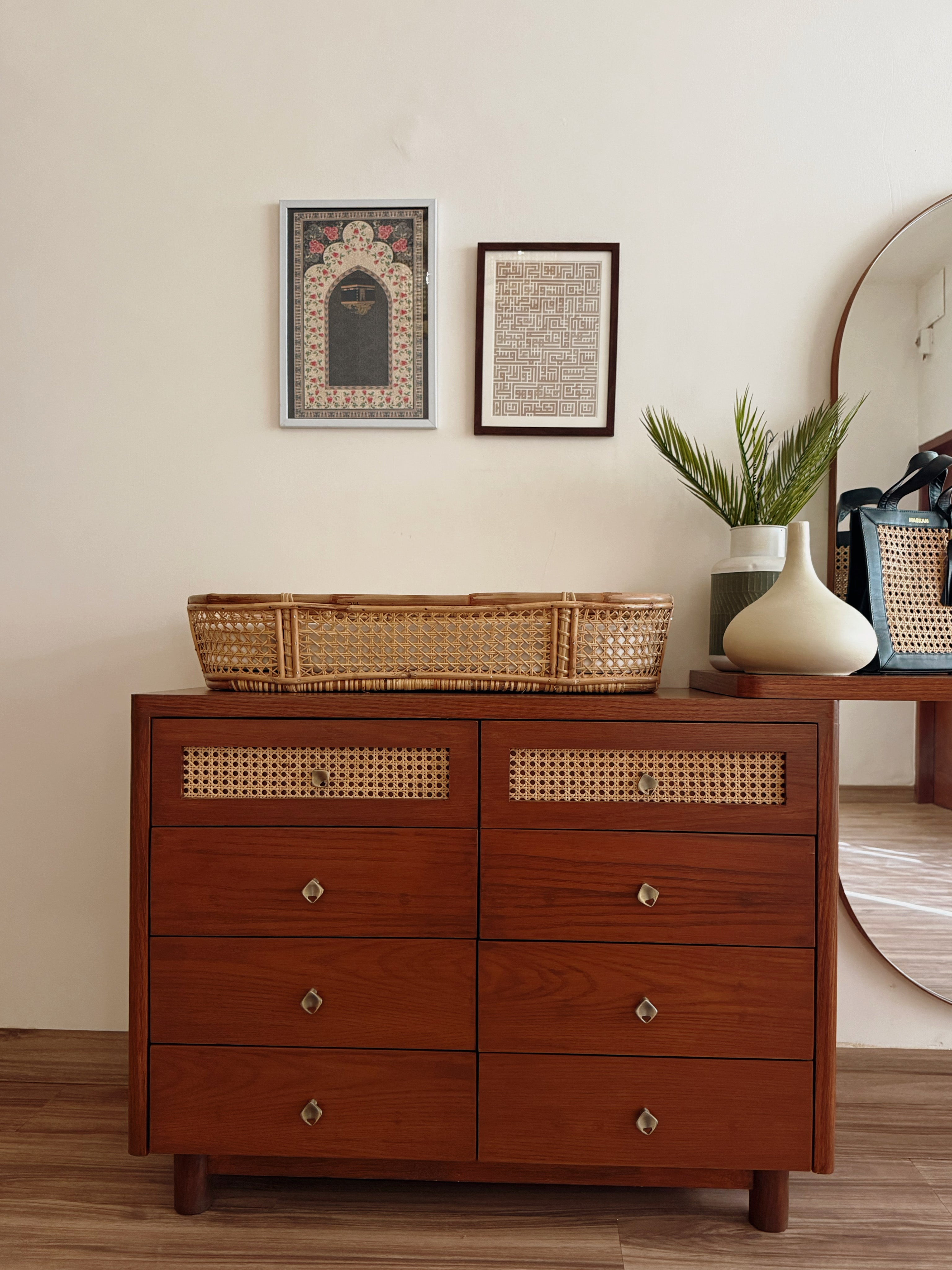 With rattan-inlay drawers for a hint of natural texture and polished knobs for a subtle shine, this vanity is both a storage solution and a statement of refined taste. Perfect for bedrooms or dressing spaces that value both form and function.