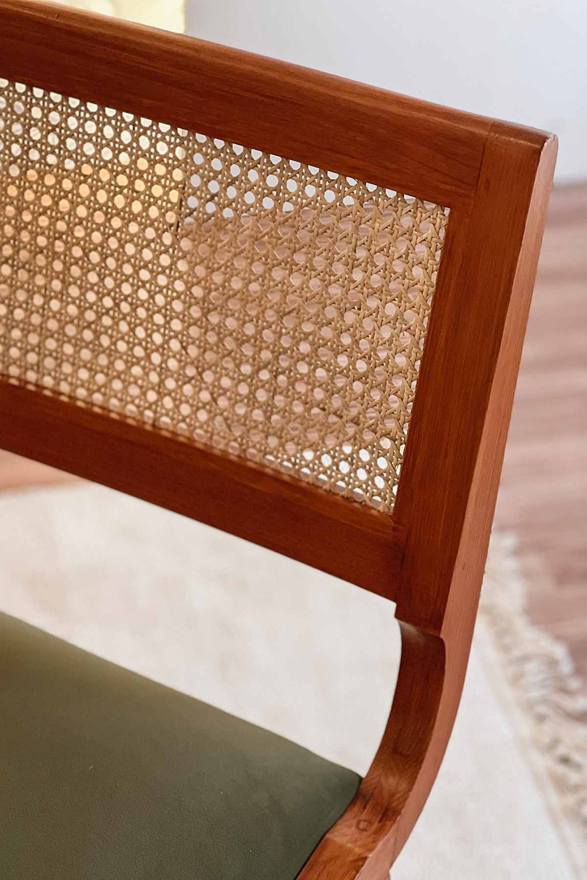 A handwoven cane back panel brings airy texture and artisanal charm, beautifully contrasted by the deep green upholstered seat—a nod to nature that grounds the piece in calm, curated style. Whether placed at a dining table, desk, or vanity, The Sage Curve Chair offers timeless elegance with an edge of modern simplicity.
